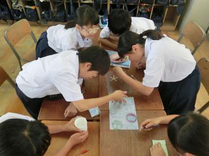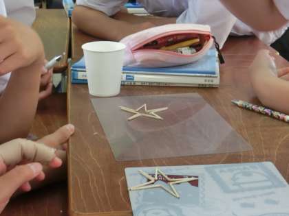 半分に折れた爪楊枝が水を吸うことによって発生する力を使って、星形の花を咲かせてみました。水を垂らすと隣の爪楊枝とくっつき、その後に互いが押し合い星形に開いていきます。きれいに開いたのは1班だけでしたが、他の班も動く姿を観察することができました。