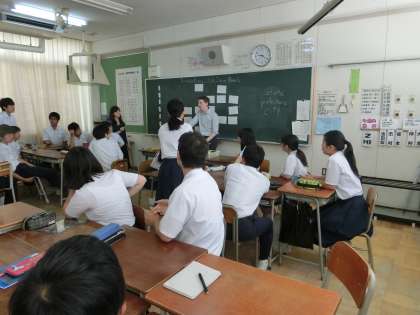 今回は、C-NETのブランドン先生の授業でした。英語のクイズを英語で答えるゲームをしました。班ごとにポイントを競いあう形の授業で、大変盛り上がりました。