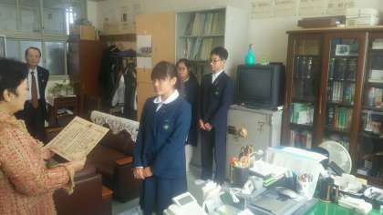 3年の河野くん、長井さん、成田さんが税の作文で表彰されました。