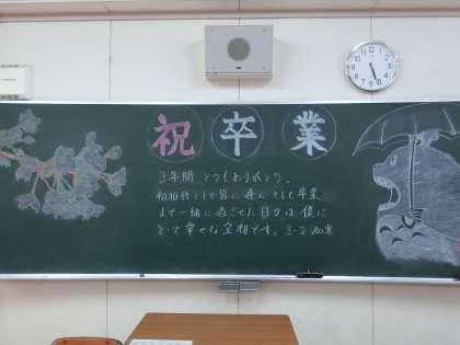 卒業式の前日は、1組では生徒から、2組は担任から黒板メッセージのサプライズがありました。また、予行の後、3年教員からは「3年間の軌跡」ムービーのプレゼントが。幼い自分や友達の写真に大笑いする人や、他の中学校に転勤した教員からのメッセージに涙する人がいました。