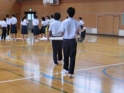 今日は体育館で活動し、作品を壁にはりつけてみました。