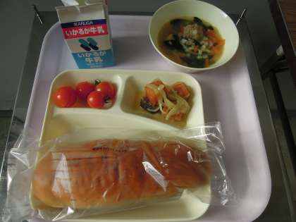 1週間ぶりの給食だった今日のメニューは「さけのマリネ」「肉だんごと麦のスープ」「プチトマト」「黒糖パン」でした