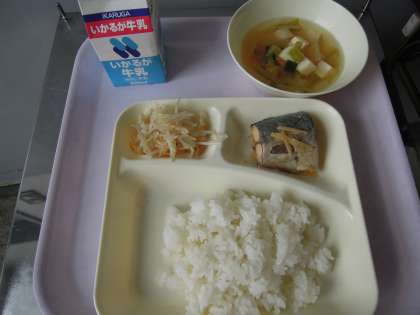 今日の給食メニューは「さばのみそ煮」「すまし汁」「もやしのゆずの香あえ」「ご飯」でした。