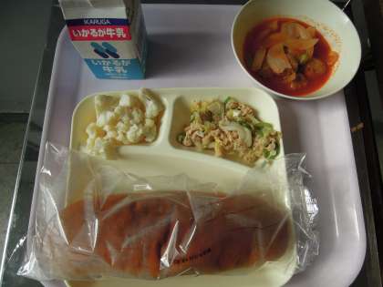 今日の給食メニューは「ミートボールと野菜のケチャップ煮」「ツナと野菜のソテー」「カリフラワーのレモン風味サラダ」「黒糖パン」でした。