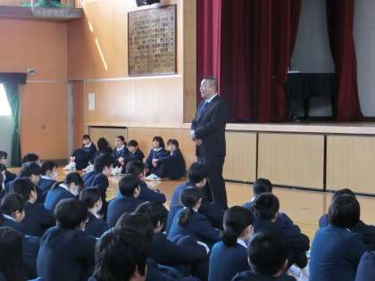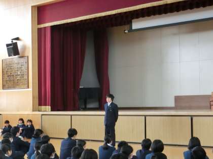 9日(金)5限に全校集会をおこない、校長先生のお話や各種委員会からの報告がありました。