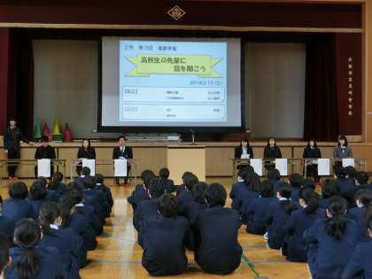 そして今回第三回目は、本校を卒業し、現在高校2年生の先輩方7名に来てもらい、それぞれの高校のようすや高校生活と中学生活の違い、後輩へのメッセージなど、進路を考える中学生にとって非常に興味・関心のある内容について話をしてもらいました。