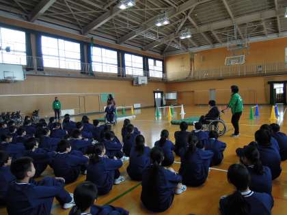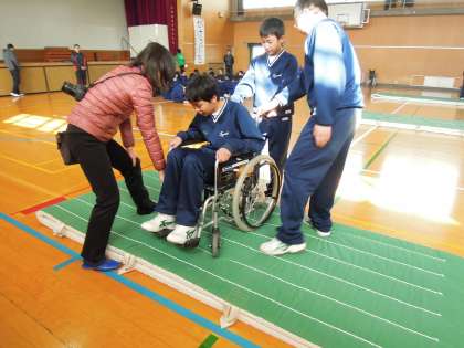 今日の5・6限は先週に引き続き北区社会福祉協議会の方々に来ていただき、障がい者理解学習として、車いす体験学習を行いました。