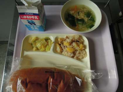 今日の給食メニューは「中華おこわ」「卵スープ」「キャベツのオイスターソースいため」「黒糖パン」でした。