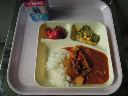 今日の給食メニューは「ポークカレーライス」「きゅうりとコーンのサラダ」「いちご」でした。