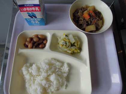 今日の給食は「肉じゃが」「はくさいの甘酢づけ」「とら豆の煮もの」「ご飯」でした。