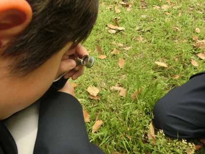 豊崎中学校北側の公園に、生えている植物の観察をルーペを用いて行いました。