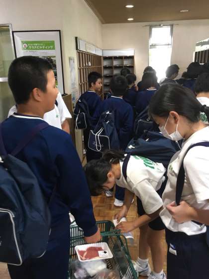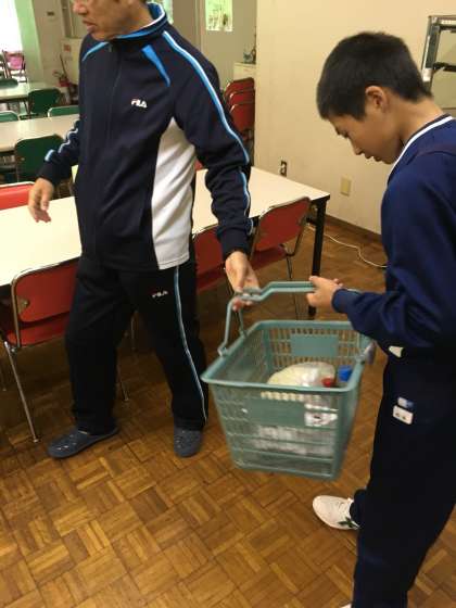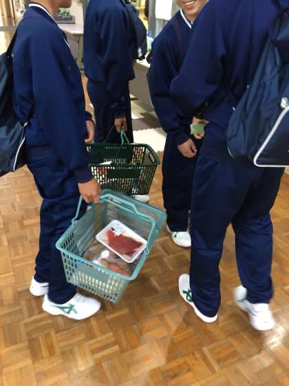 カレーを作るために食堂で材料をもらって、炊事場へ向かいます。
