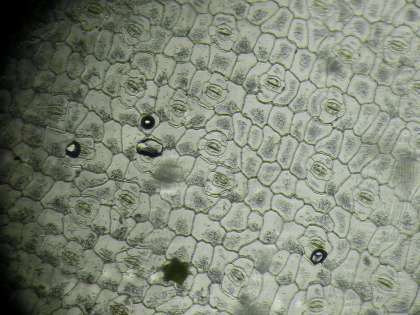 ツユクサの葉の裏にある、うすい皮をめくり、気孔を顕微鏡で観察しました。