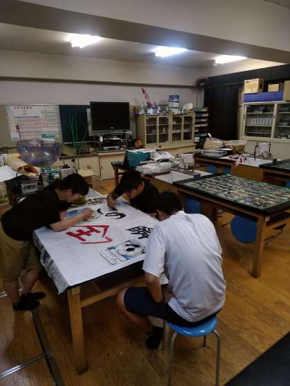 夜になり、先生方が何やら集まり作業しています。 何でしょう。旗は全学級できたはず・・・