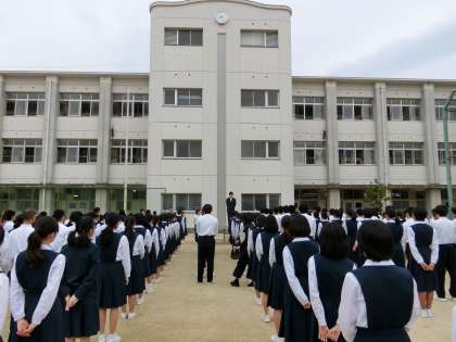 全校集会が本日朝おこなわれ、校長先生のお話の後に、任期を終える各種委員・学年代表が全校生徒の前で話しました。3年生の各種委員長からは、この半年間で学校が良くなったことなどを発表してもらいました。