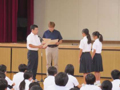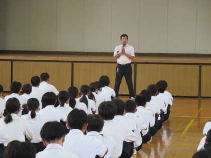 始業式では、女子ソフトテニス部と柔道部の活躍が讃えられ、表彰が行われました。続いて、校長先生と生徒指導主事の先生から、2学期に向けたお話がありました。