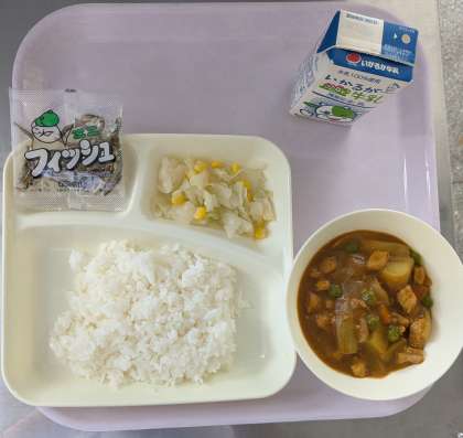 本日の給食は チキンカレーライス キャベツとコーンのサラダ ミニフィッシュ です。