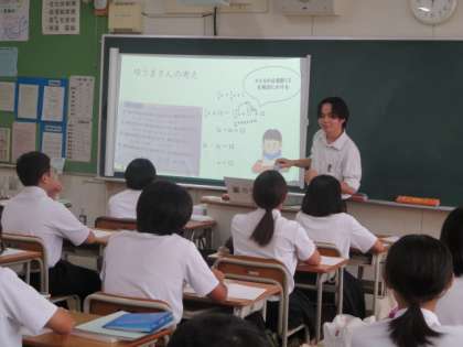 数学の教師をめざしている教育実習生が、研究授業を1年2組で行いました。実習の成果を発揮しながら授業を進めていました。