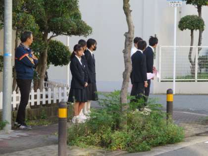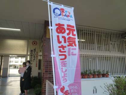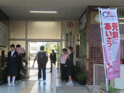 風紀委員が正門や道路に立って、あいさつ運動をしています。
