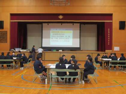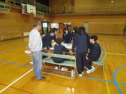 3年生は、体育館で避難所開設について学びました。校舎配置図を使いながら、どこに補給物資を保管するかなどを話し合っていました。