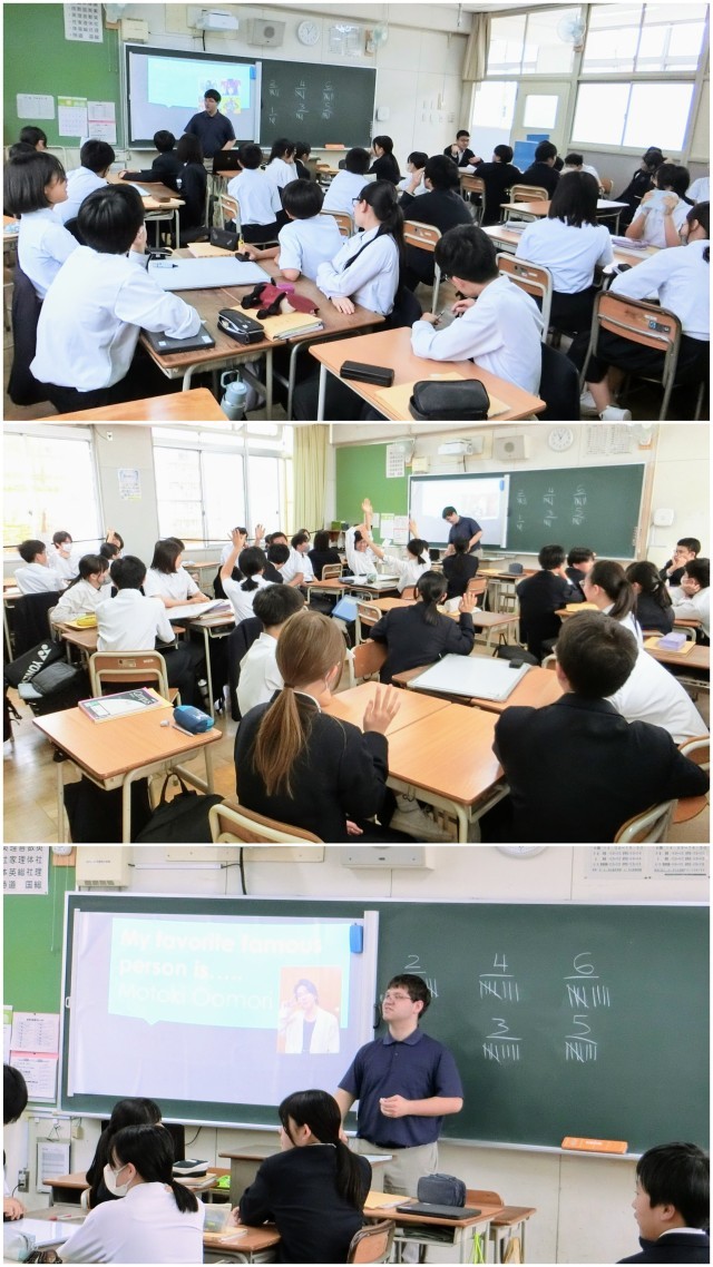 初回ということで、今日はあいさつと自己紹介で、2年生でも、前半は先生に関するクイズ大会(my favorite ~ ?)を班対抗ポイント制で行い、後半は個別の質問タイム(any question)でした。