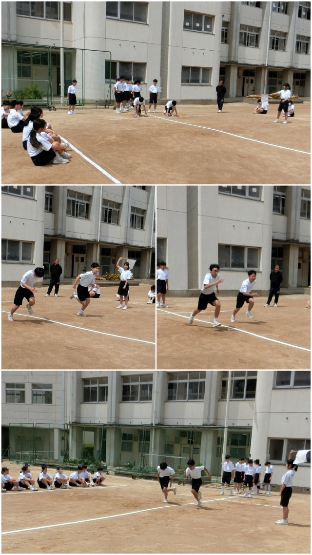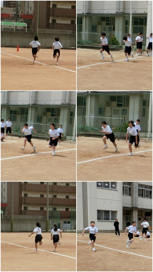 今日は「走力」にあたる「50m走」のタイムを2人1組でグランドで測定していました。クラウチングスタート、スタートダッシュは前回の授業で練習しています。昼休みには、意識のある生徒どうしで練習する姿も見られました。