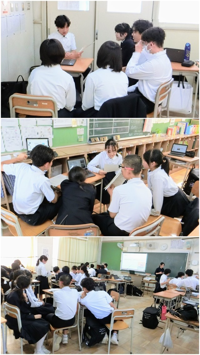 今日は6時間目、まず、前半でスライドの最終仕上げ、中盤で班内での発表(班員へのレクチャー)を行い、後半は先生の作成した12題のも問題に班対抗戦で答えていって、ポイントを獲得していきました。
