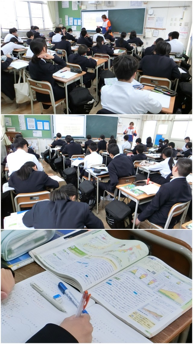 授業の後半では、「人口ピラミッド」も学習し、日本の戦前から現代、そして未来の人口ピラミッドの型の変化についても学習し、どんどんと進んでいく「少子高齢社会」の大きな課題も学びました。