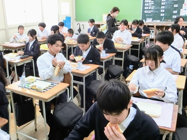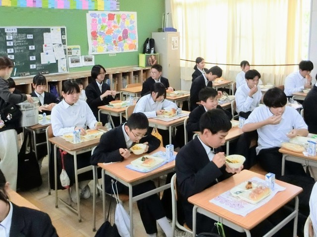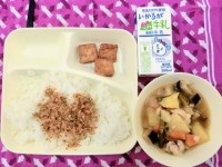 カレースープスパゲッティは、ベーコンをから炒りしてから、綿実油で鶏肉、人参、玉ねぎ、ピーマンを炒め、湯を加えて後、しめじも加えて、カレールーの素(米粉)、チキンブイヨン、塩で味付けをし、最後に固めに下茹でしたスパゲッティを加えて煮込まれています。子どもたちに人気のカレーとスパゲッティの最強の組み合わせで、食缶は一瞬で空っぽでした。