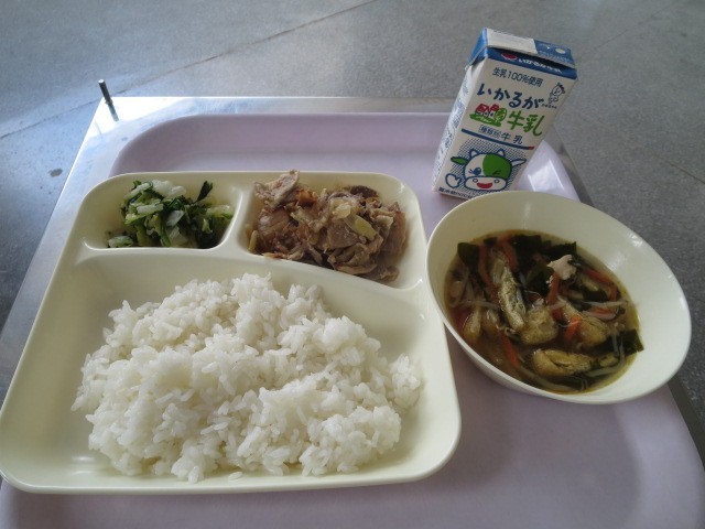 今日の給食は豚肉のスタミナ焼き五目汁菊菜と白菜のおひたしごはん牛乳です。