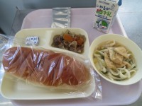 本日の給食は豚肉とごぼうの煮物なにわうどんとろろこんぶ固形チーズ牛乳です。