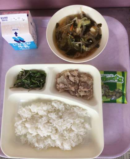 豚肉のおろしじょうゆかけ、みそ汁、じゃこピーマン、まっ茶大豆、ご飯、牛乳となっております。