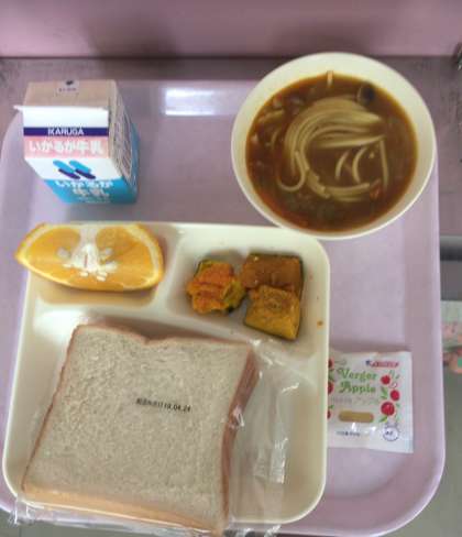 4月25日(木)給食献立 公開日 2019/04/25 更新日 2019/04/25 お知らせ カレースープスパゲッティ、焼きかぼちゃ、あまなつかん、りんごジャム、パン、牛乳となっております。 いいね(0)