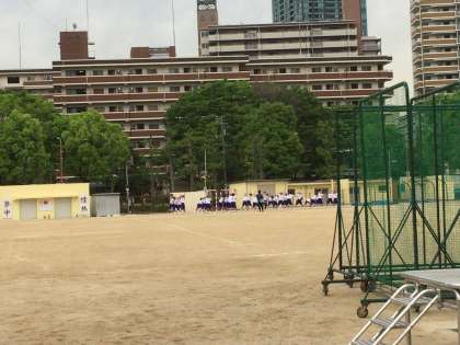 本日の天気はどんより曇り空ですが、グラウンドでは体育の元気な声が響いています。
