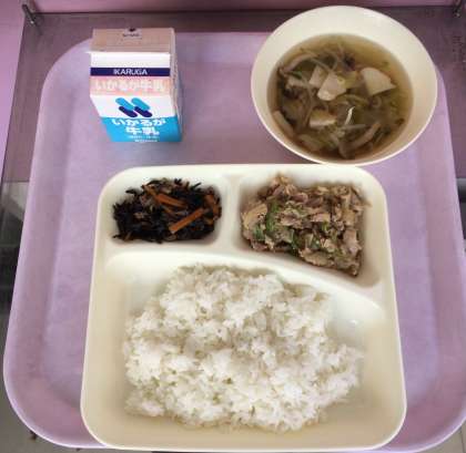 豚肉のごまだれ焼き、五目汁、ひじきのいため煮、ご飯、牛乳となっております。