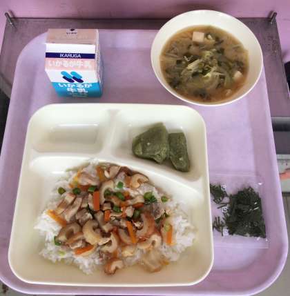 かやくご飯、みそ汁、まっ茶ういろう、牛乳となっております。