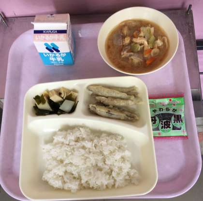 きびなごてんぷら、豚汁、わかたけ煮、ソフト黒豆、ご飯、牛乳となっております。