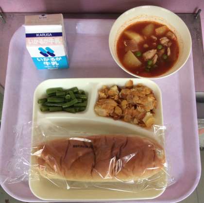 ケチャップ煮、さんどまめのソテー、りんごのクラフィティ、パン、牛乳となっております。