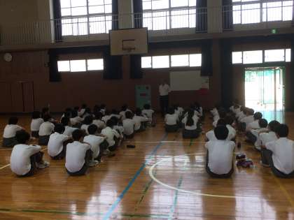 6限目、2年生は体育館で校外学習の全体指導を行っています。