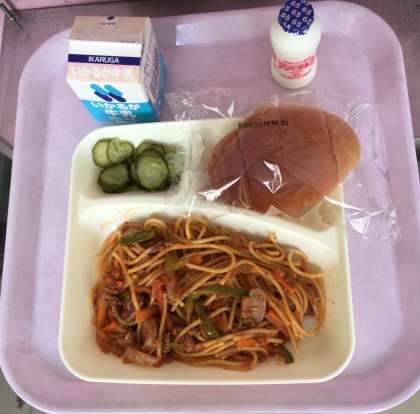 スパゲティミートソース、きゅうりのバジル風味サラダ、発酵乳、パン(1/2)、牛乳となっております。