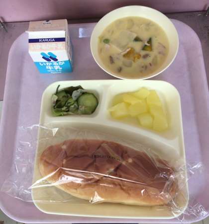6月21日(金)給食献立 公開日 2019/06/21 更新日 2019/06/21 お知らせ かぼちゃのクリームシチュー、ミックス海そうのサラダ、りんご(カット缶)、パン、牛乳となっております。 いいね(0)