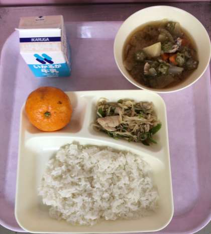 ピリ辛野菜いため、オクラとん汁、みかん(冷)、ご飯、牛乳となっております。