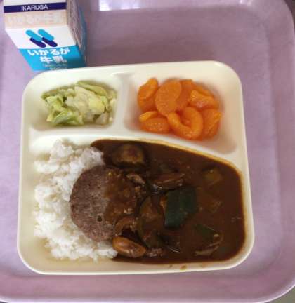 夏野菜のカレーライス、焼きハンバーグ、キャベツのサラダ、みかん(缶)、牛乳となっております。
