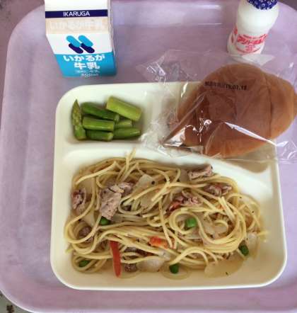 ポークトマトスパゲッティ、グリーンアスパラガスのサラダ、発酵乳、パン(1/2)、牛乳となっております。