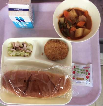 チキンレバーカツ、ケチャップ煮、たことキャベツのソテー、りんごジャム、パン、牛乳となっております。