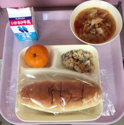 豆乳マカロニグラタン[米粉]、トマトスープ、みかん(冷)、パン、牛乳となっております。