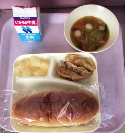 あげぎょうざ、中華煮、和なし(カット缶)、パン、牛乳となっております。