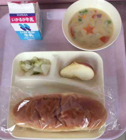コーンクリームシチュー[米粉]、はくさいのピクルス、りんご、パン、牛乳となっております。