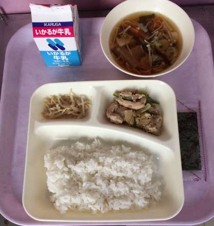 10月7日(月) 給食献立 公開日 2019/10/07 更新日 2019/10/07 お知らせ 鶏肉のごまだれ焼き、ソーキ汁、もやしのしょうがじょうゆあえ、焼きのり、ご飯、牛乳となっております。 いいね(0)