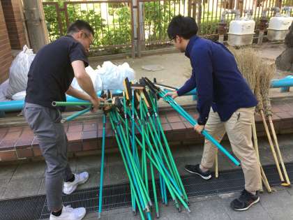 「クリーンしんとよ」と銘打って、校内や学校周辺の清掃を行います。 先生が先に準備をしています!